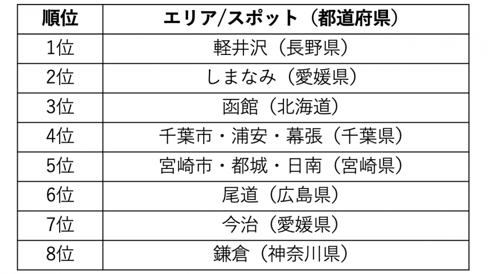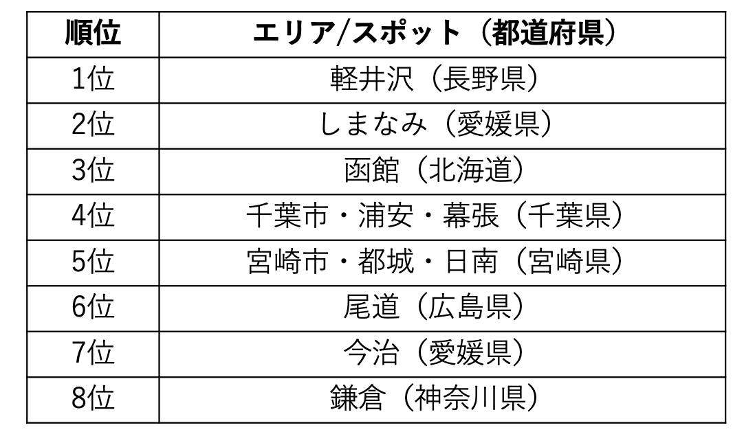 また一年中あたたかい気候で自然も豊富で物価も安いエリアとして人気の宮崎市・都城・日南(宮崎県)や、日帰りのお出かけエリアとして女性に特に人気の高い鎌倉(神奈川県)尾道(広島県)もランクインしました。